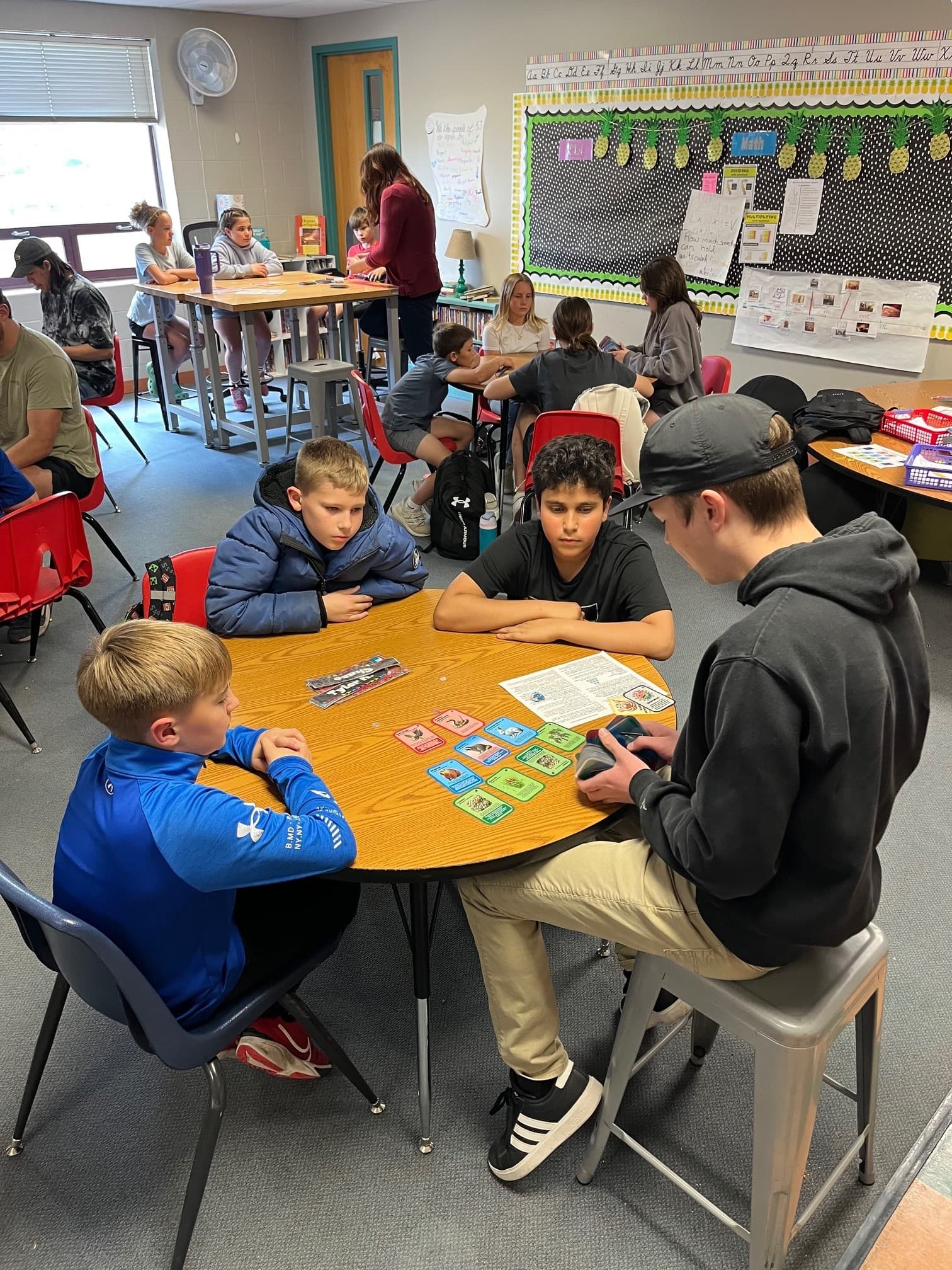 A student from the Environmental Stewardship class at McPherson College teaches local elementary school students how to play the EcoPyramid game. The game was one of the projects that received a Horizon Fund Grant.